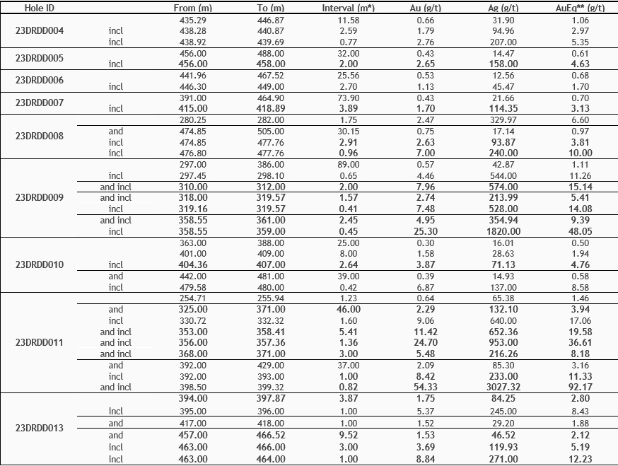 - 23DRDD011, the most easterly hole in the high-grade panel intersected upper and lower zones of broadly dispersed mineralization, both of which contain higher-grade sub intervals (Figure 1):