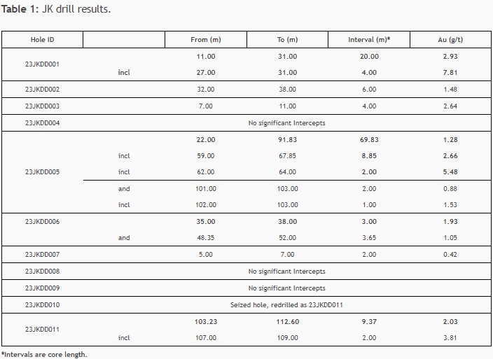 - Drillhole 23JKDD001 returned 20.00 metres (m) of 2.93 grams per tonne gold (g/t Au).